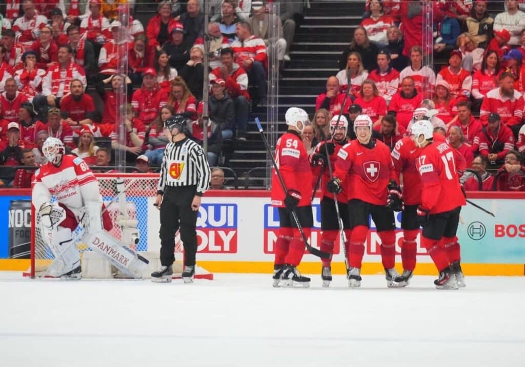 L’équipe de Suisse en demi-finale des championnats du monde 2025 contre le Danemark (victoire 7-0)